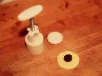 5.接下來就是入陷和成型,也是很重要的兩步。入陷的時候就像包餃子,不過要先把餡揉成圓形比較好把握,然后封口的時候也要用力啊,不要有縫隙。放進模具之前給入了餡的面團上沾點事前留好的月餅粉,這樣不會粘模具,給案板上也撒點。